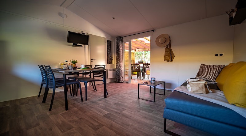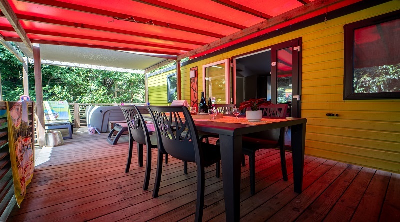 Terrasse bois semi-couverte avec salon de jardin et bains de soleil.